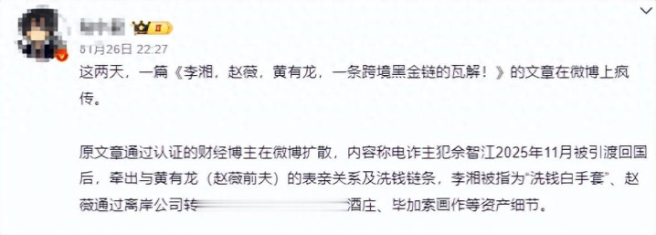 就在2026年1月25日,一篇名为《李湘,赵薇,黄有龙……》的文章一经发表,便在微博上引发了轩然大波,谁都没有想到,那个曾靠“小燕子”红遍全国的赵薇,居然会在某天被人指控帮人转移“赃款”。