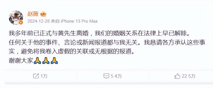 不知网友们是否注意,在2024年的时候,被迫退圈许久的赵薇突然在微博中官宣了如此消息,她正式宣布要与前夫黄有龙彻底划清界限。