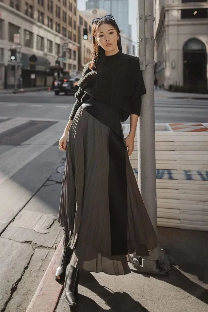百褶裙那轻盈的姿态,能压得住毛衣的厚重,也能衬出女人的风姿。