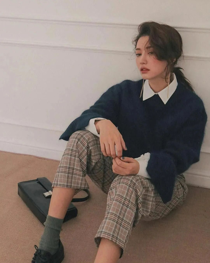 格纹毛衣马甲搭配Oversize白衬衫,外加一双马丁靴,便是一种漫不经心的美式学院风。