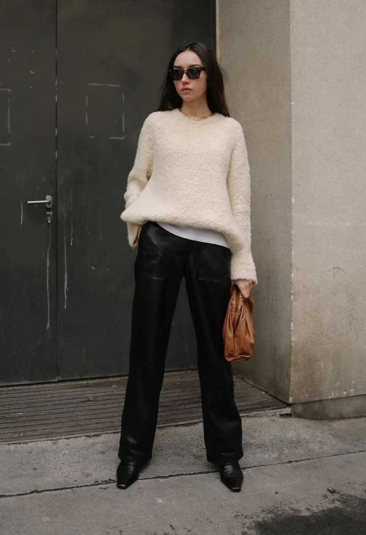 亮色毛衣配黑皮裤,甜酷刚好,像喝半杯糖的咖啡。