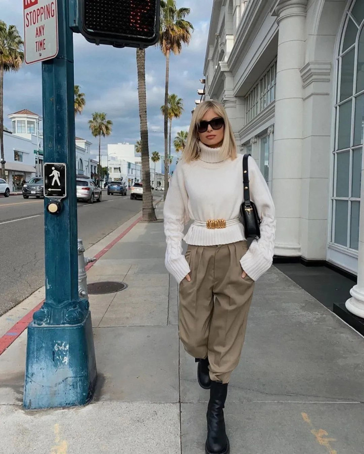 毛衣宽松也没什么大不了的,只要把下摆往裤腰里头一塞,高腰线就跟着往上提,慵懒自然也就变得率性起来。
