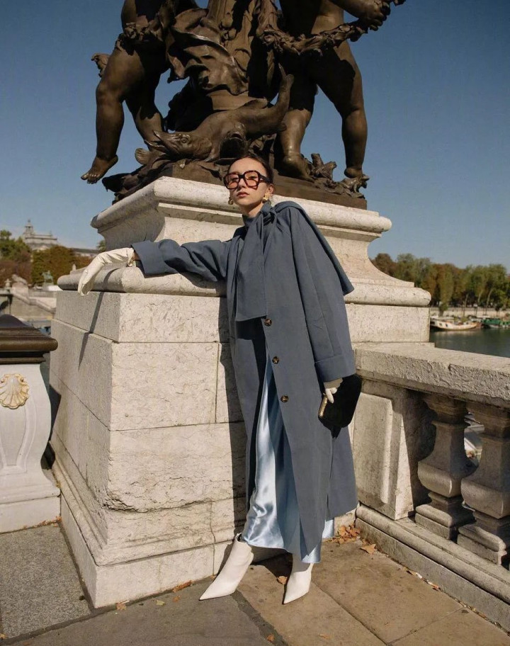 最爱是缎面裙,清冷贵气,外罩毛衣,再披修身大衣。