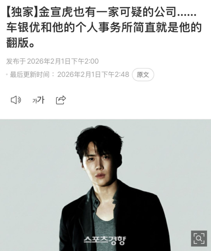 报道称金宣虎和车银优情况相似,两人都在所属公司之外运营着由家族掌控的法人公司,金宣虎通过这个法人进行实质性的“tsls”。