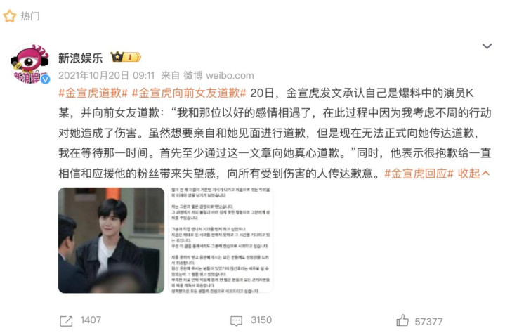 金宣虎本人也发文道歉,称“双方以美好感情开始,但因自己考虑不周的行动伤害了她”,同时还向剧组人员、粉丝致歉。
