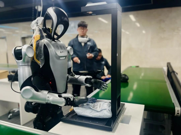 在青岛市东谈主形机器东谈主数据蚁合探员场,东谈主形机器东谈主正在学习分拣快递。