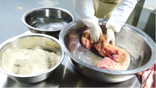 走进贵州安顺溪桥食物有限公司,精选的带皮猪肉进程修整,被均匀涂抹上混杂了盐、花椒及多种香料的秘制配方。