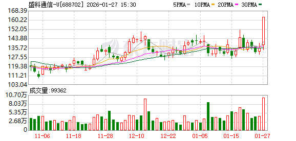 1月27日盛科通信-U(688702)收盘价162.53元,收盘涨停,全天换手率4.89%,振幅21.66%,成交额14.61亿元。科创板交易公开信息显示,当日该股因日收盘价涨幅达15%等上榜。