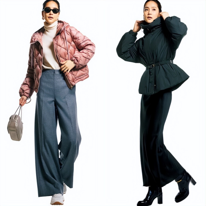 雾霾粉羽绒服搭配灰色高腰裤,显得沉稳利落。将视线集中在上半身,就能营造出高腰美人感。