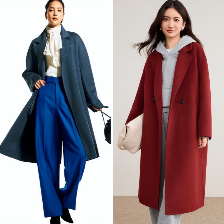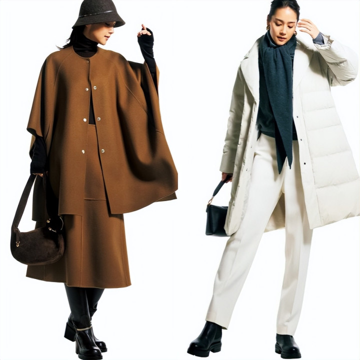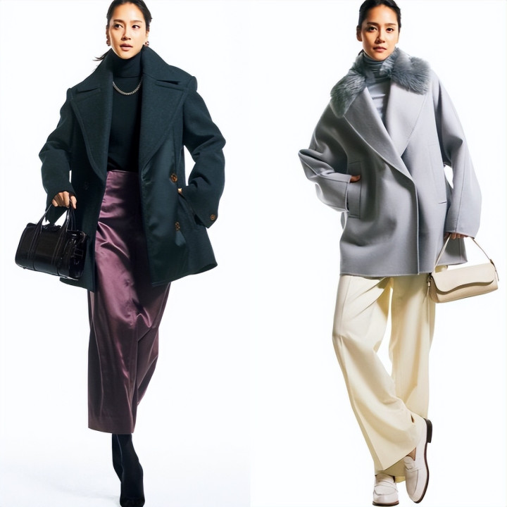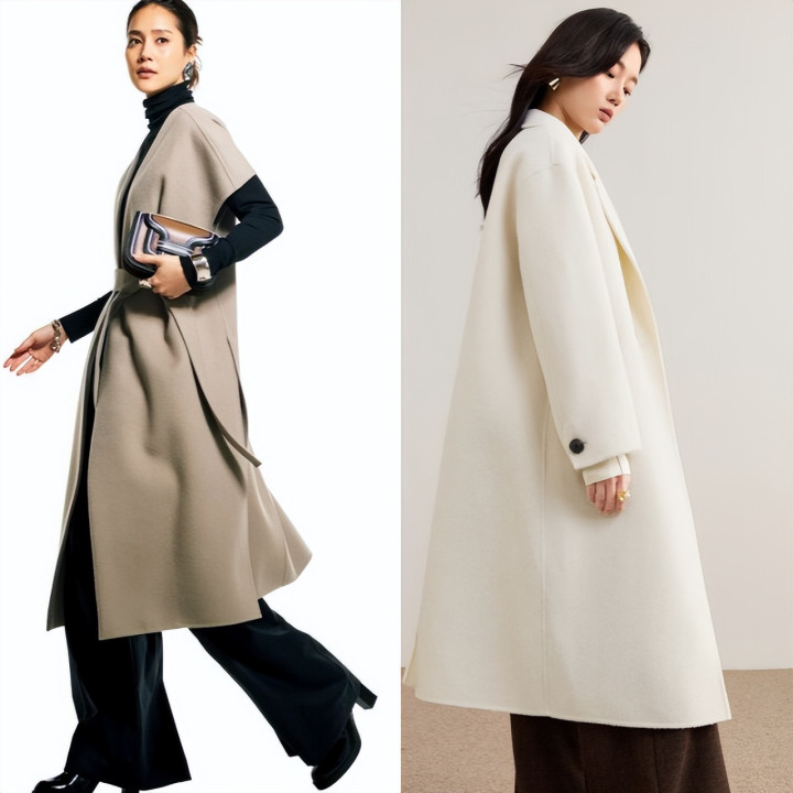米白色大衣的柔糯质感与宽松廓形自带高级松弛感,A字设计增添了灵动细节;深棕阔腿裤作为下装,用低饱和的暖调撞色让整体造型更显层次,垂坠版型也进一步强化了优雅气质。