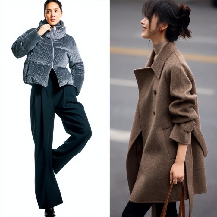 黑色腰带短款羽绒服,以其优雅的腰线剪裁为亮点。搭配柔顺的黑色半身裙,避免重心下移,兼顾得体感与显瘦效果。