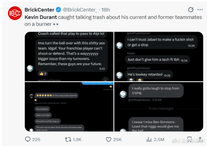 好意思媒BrickCenter也爆料了疑似杜兰特小号的事件,因为这个账号在社媒上多样炮轰杜兰特的前队友、现队友。