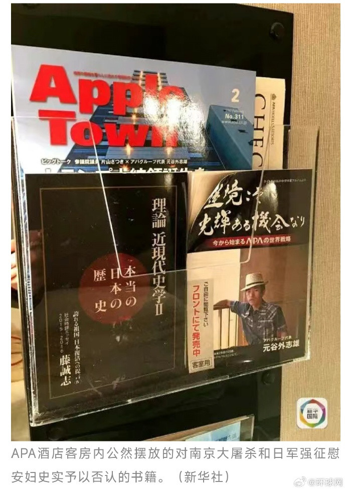 {jz:field.toptypename/}2017年1月,有多名中外搭客发现,APA酒店客房内摒弃了多本元谷外志雄撰写的竹素,书中对南京大屠杀和日军强征慰安妇等史实赐与狡赖。音讯曝光后,元谷外志雄在APA集团官网和应付媒体平台贯串发表声明,正规澳门游戏官网拒不撤下关联竹素,激励了中国等多国大家的浓烈降低。