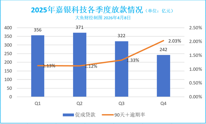客岁该公司放款量捏续放松。2025年,嘉银科技单季促成贷款限制由356亿元降至242亿元,与此同期,嘉银科技落后率主义捏续攀升,第一季度末,嘉银科技90天+落后率仅为1.13%,第四季度末飞腾至2.03%,钞票质地捏续承压。