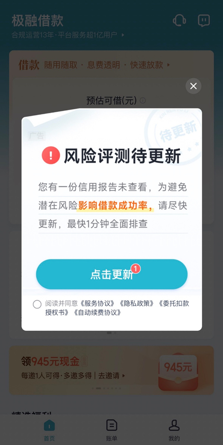 新黄河记者在使用极融借债App时,屡次收到风险评测待更新弹窗提醒,弹窗页面中领导“为幸免潜在风险影响借债到手率”,其中“影响借债到手率”由亮色标注。