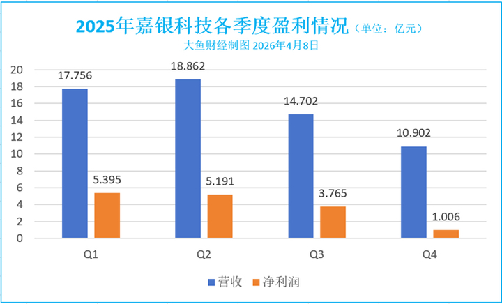 分季度看,客岁该公司净利润呈现明显的逐季下滑态势。2025年第一季度,该公司净利润达到5.395 亿元,第二季度净利润小幅度放松至5.191 亿元。第三季度运行,嘉银科技的盈利景况明显下滑,营收鉴别下落至14.7亿元、10.9 亿元,净利润同步缩水至3.765亿元、1.006亿元。第四季度净利润同比下滑了6.35%,环比下降73.28%。