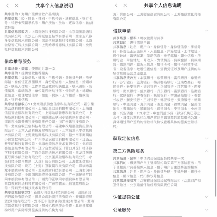 新黄河记者体验你我贷、极融借债时发现,两款产物均为多家第三方公司提供借债导流、保举劳动。分享个东谈主信息评释显现,两款产物与近10家开展借债导流和谐,包括上海迦数科技有限公司、北京国好意思融通科技有限公司等;借债保举劳动机构超40家,包括北京君航微金信息科技有限公司、霍尔果斯云逸科技有限公司、福建中改增惠融资担保有限公司品级三方助贷、贷超平台,以及新疆万鸿信息科技有限公司等。