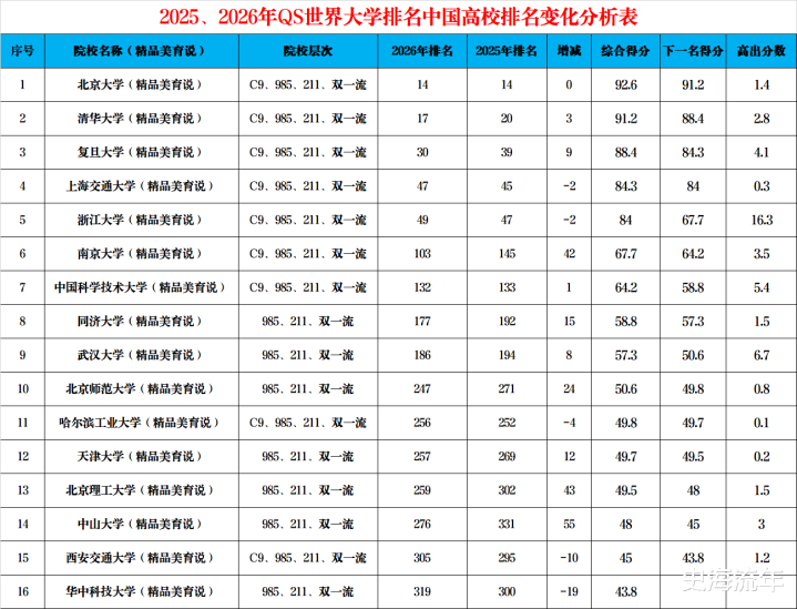 华中科技大学得分43.8分,名次内地高校第十六位。2025年QS名规律300位,2026年QS名规律319位,名次着落了19位,名次着落幅度之大,令东谈主骇怪。