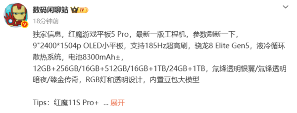 【CNMO科技讯息】4月14日,博主“数码座谈站”独家爆料,红魔新一代游戏平板——红魔游戏平板5 Pro的详备工程机参数再度刷新。算作红魔在游戏平板鸿沟的年度力作,红魔游戏平板5 Pro在屏幕、性能、散热、存储以及外不雅筹谋等多个维度均展现了“行业天花板”级别的实力。